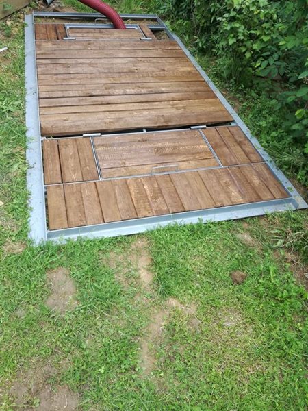 Konstrukce má dvoje dvířka na panty pro přístup k nádržím. Ocelovou konstrukci jsme svařili tak aby byla konstrukce po vyplnění prkny tak pevná aby se po ní dalo bezpečně chodit. Konstrukci jsme po svaření natřeli antikorozním nátěrem a povrchovou barvou. Konstrukci jsme po dokončení povrchové úpravy dovezli zákazníkovi až na místo určení / zahrádkářskou kolonii v Třebíči/a tam ji také usadili na místo určení.