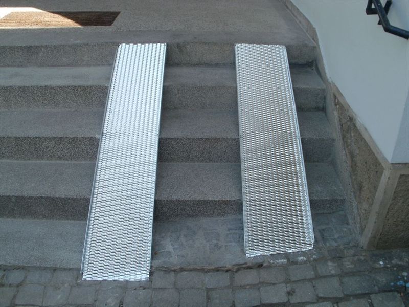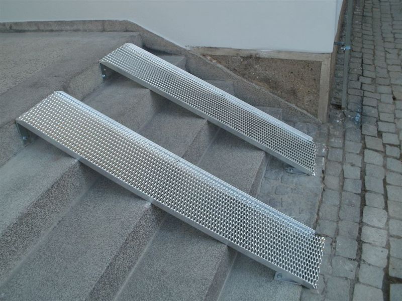 Nájezd jsme vyrobili v naší výrobní hale zakázkového zámečnictví a kovovýroby v Krahulově a montáž provedli v Třebíči. Je vyrobený z perforovaného ocelového materiálu který bude zabraňovat klouzání nájezdu a nebude se na něm v zimním období držet sníh a led. Ocelový nájezd na schody jsme vyrobili s vyvýšenými okraji které zamezí vyjetí vozíku nebo kočárku mino nájezd. Tím je zabezpečena vysoká bezpečnost nájezdu.