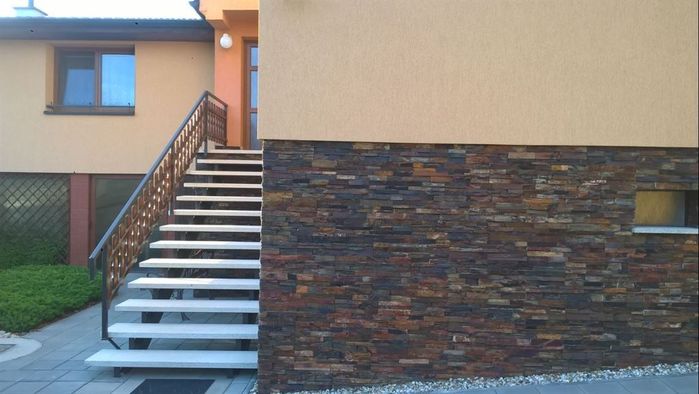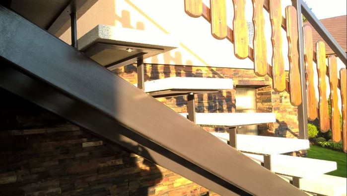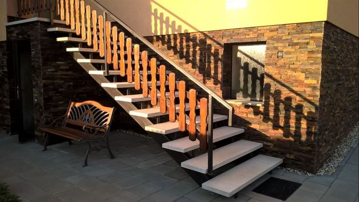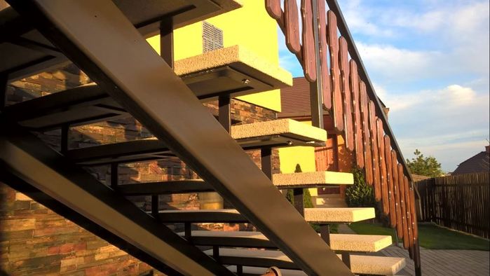 Vyrobili jsme venkovní železné samonosné schodiště k rodinnému domu. Konstrukce schodiště a zábradlí je ze železných profilů, nášlapy schodiště jsou betonové a šprušle zábradlí jsou z masivu s povrchovou úpravou dřeva lakováním.